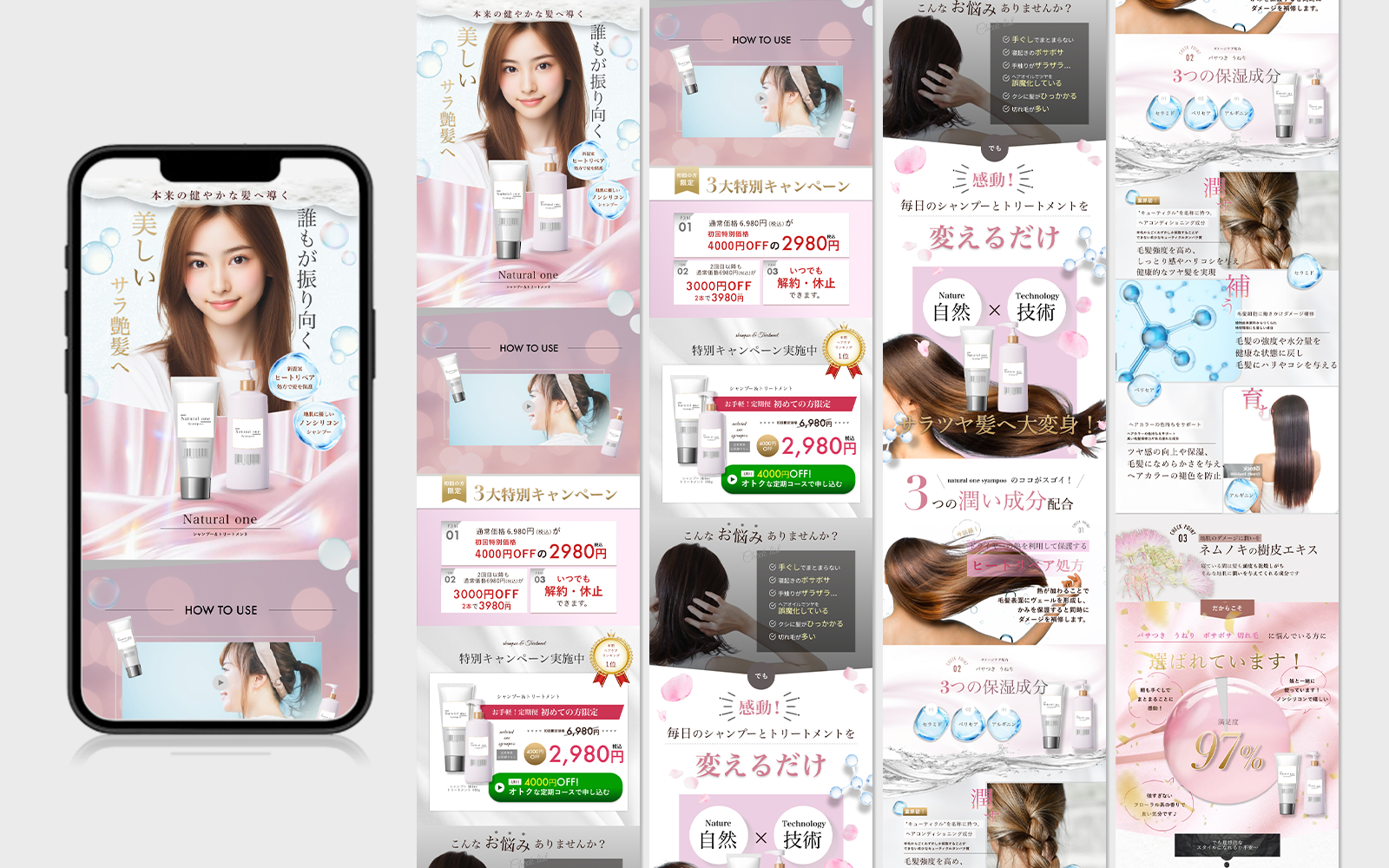 ヘアケアブランドのシャンプー&トリートメントのLPを制作いたしました。お客様の「本来の健やかな髪を取り戻し、誰もが振り向く美しい艶髪へ」という想いをしっかりとビジュアルで表現することを心がけました。