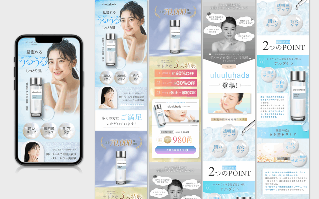 美しさを引き出す「うるうるしっとり美容液」のLPを制作しました。このサイトでは、製品の特長や効果をわかりやすく解説し、使う人の肌が本来持つ美しさを最大限に引き出すことを目指したデザインを心掛けています。独自の保湿成分配合で、あなたの肌に潤いと輝きを。