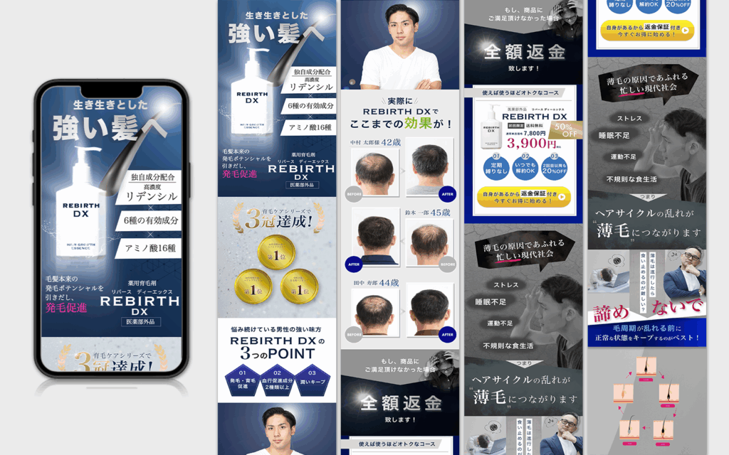 革新的な育毛剤「REBIRTH DX」のLPを制作しました。このサイトでは、先端科学に基づく成分と独自の育毛メカニズムをわかりやすく解説し、全ての年齢層のお客様が安心して利用できるようにデザインしました。信頼性の高い研究結果と実感できる効果を、明確にご紹介しています。