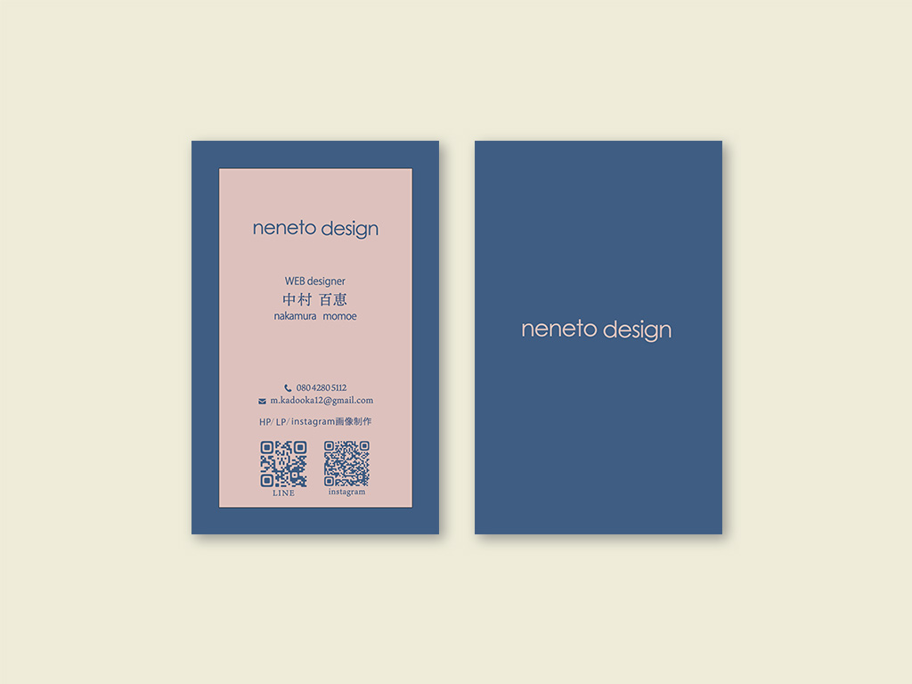 名前にももが入っているので桃色を使い、ネイビーで信頼感が伝わるように前面に配色しました。女性らしい中にもクールな要素が盛り込まれている名刺です。
