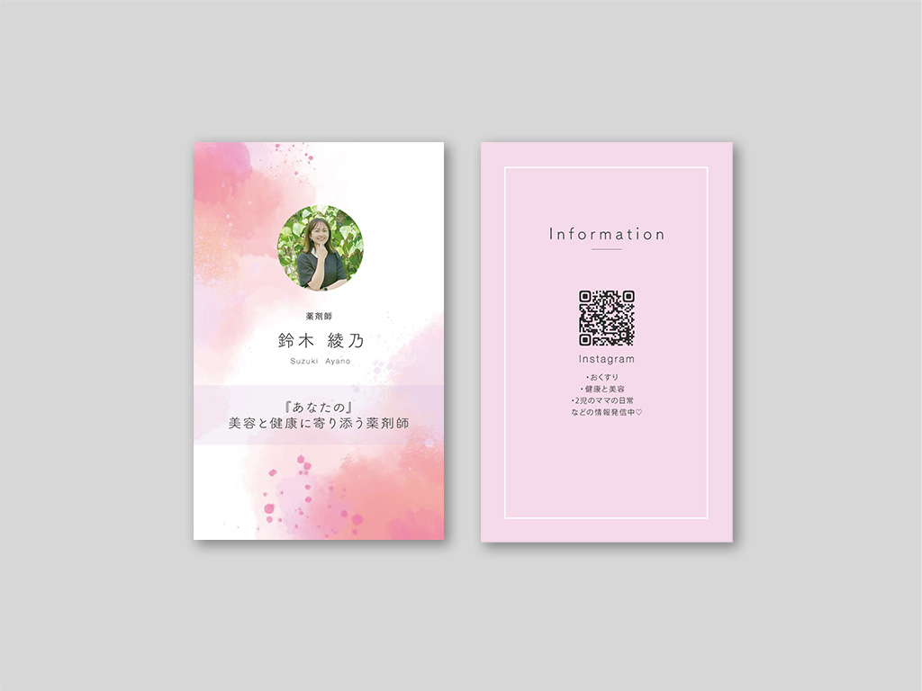 ピンク系の水彩デザインをメインにし、暖かさと安心感を表現。薬剤師という威厳のある職業なので、『薬剤師』の文字フォントにこだわり、安心の中にも信頼感が強いデザインに仕上げました。