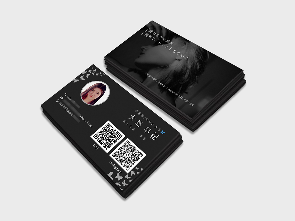 黒を基調にしたシックなデザインで、高級感と大人の落ち着きを表現しました。表面には本人の写真とQRコードを配置し、スムーズにSNSへ誘導できる導線を確保。裏面にはモノクロ写真を用い、「洗練」「自分らしさ」「美しさ」というテーマを直感的に伝える仕上がりにしました。両端の蝶の部分は箔押し印刷でシルバーでキラッとひかる仕様にしております。